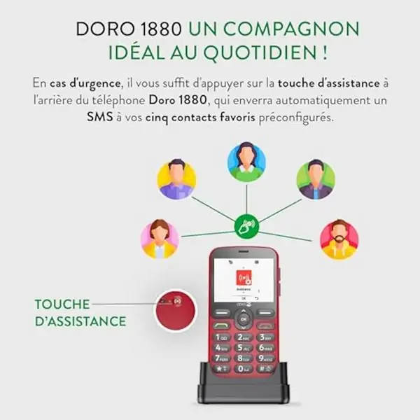Élégant, le Doro 1880 vous offre un son de qualité et diverses fonctionnalités pratiques, notamment la touche d’assistance et la compatibilité avec les appareils auditifs (HAC). Et avec son grand écran de 2.8″ à résolution 240 x 320 pixels, naviguez en toute facilité.