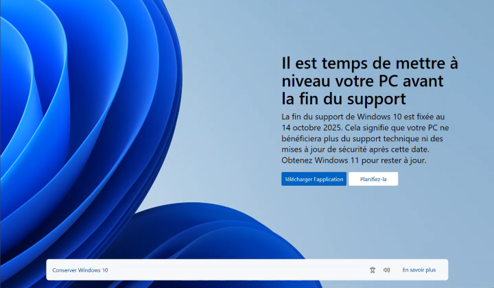 A compter du 14 octobre 2025, Windows 10 atteindra la fin du support. « A partir de cette date, les ordinateurs encore équipés de ce système d’exploitation ne recevront plus de nouvelles mises à jour de sécurité, de correctifs logiciels non liés à la sécurité, d’options de support assisté gratuit ou de mises à jour gratuites des contenus techniques en ligne de la part de Microsoft. Il est possible que des programmes tiers ou des programmes de support payants continuent à fournir un support, mais il est important de savoir que le support Microsoft ne fournira plus de mises à jour ou correctifs publics pour Windows 10.